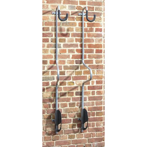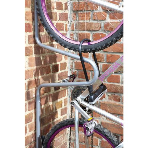 - Uchwyt rowerowy montowany na ścianie, wyposażony w gumowy hak chroniący przednie koło.