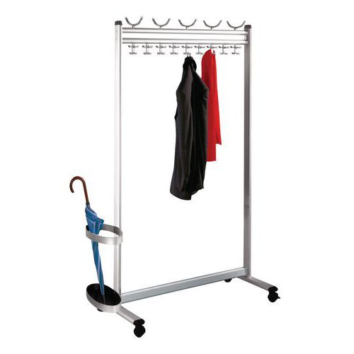 - Mobilny wieszak z haczykami na czapki i ubrania oraz 4 blokowanymi pojedynczo kółkami.