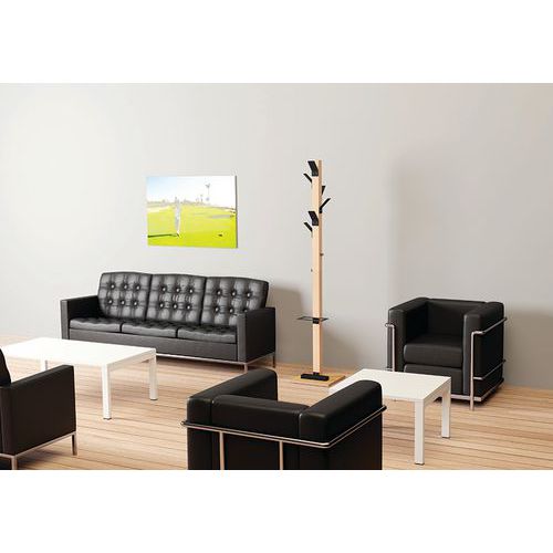Sześć wieszaków na ubrania z wytrzymałego polistyrenu. Dwa haczyki na akcesoria z chromowanej stali. Słupek z litego drewna bukowego, przekrój 60 mm x 60 mm. Podstawa ze sklejki 35 cm x 35 cm, grubość 20 mm.