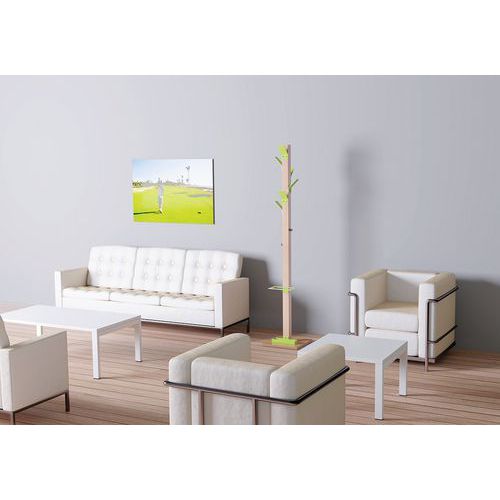 Solidny lakierowany słupek bukowy z kolorowymi haczykami, uchwytem i półką na parasole.