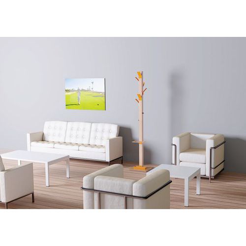 Sześć odpornych na uderzenia plastikowych wieszaków na ubrania. Dwa haczyki ze stali chromowanej na akcesoria. Słupek z litego drewna bukowego 6 x 6 mm. Podstawa ze sklejki 35 cm x 35 cm, grubość 2 mm.