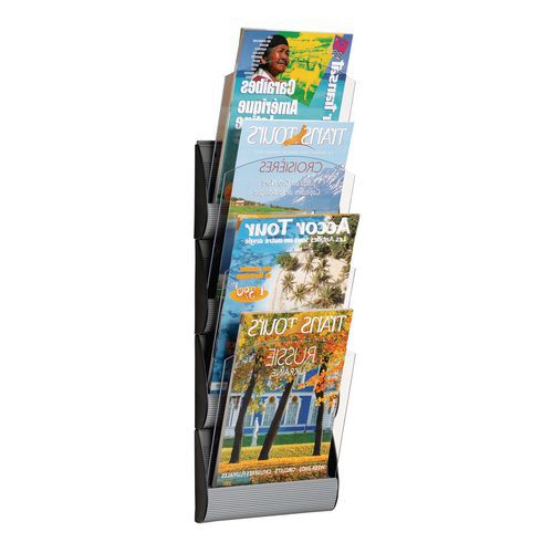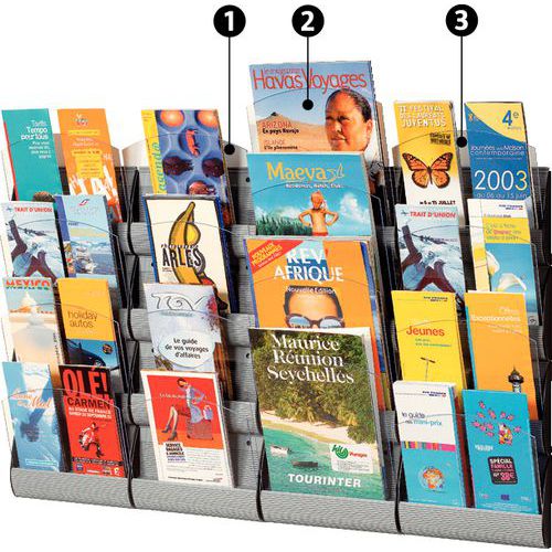 Uchwyt ścienny z przezroczystymi przegródkami wyraźnie eksponuje Twoje broszury reklamowe. Duża pojemność dzięki przegródce o szerokości 2,3 cm. Łatwe mocowanie urządzenia do ściany za pomocą praktycznego systemu zatrzaskowego.