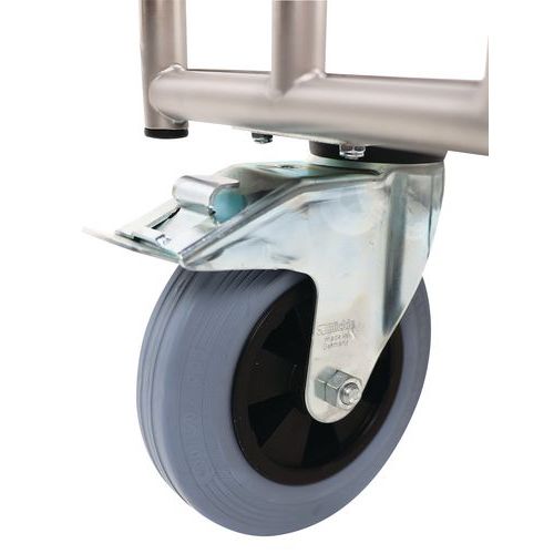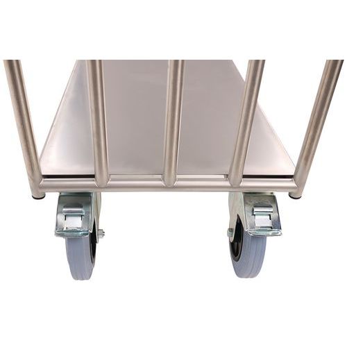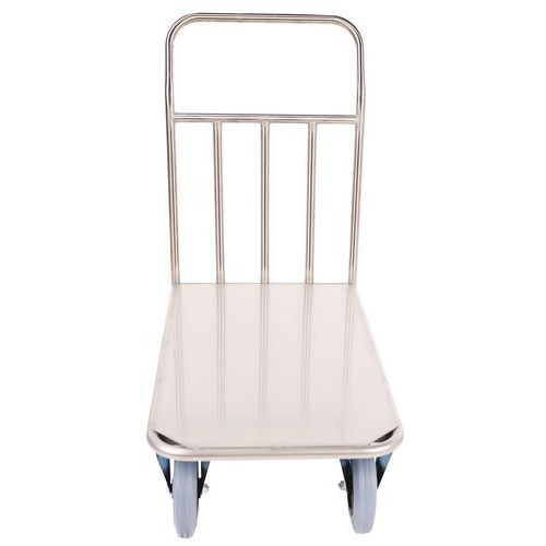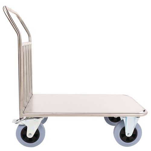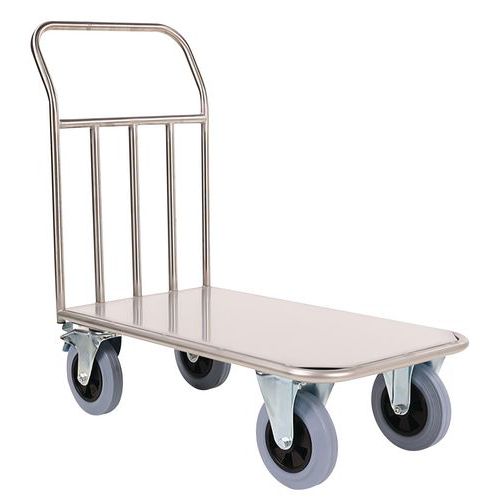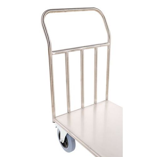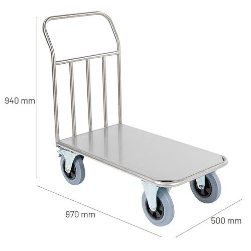Platforma transportowa ze stali nierdzewnej, przeznaczona do przemieszczania produktów w kuchniach. Powierzchnia ładunkowa ze stali nierdzewnej, uchwyt wykonany z profili stalowych o średnicy 25 mm. Mobilność zapewniają kółka skrętne o średnicy 20 cm, dwa z nich posiadają hamulec z ocynkowanej stali chromowanej.