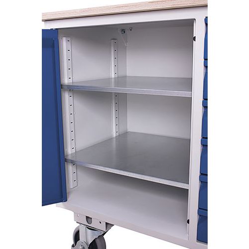 - Zamykana szafka wyposażona w jedną stałą i dwie regulowane półki (nośność na półkę 30 kg).