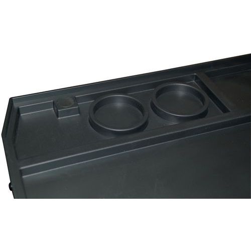 Mobilny pulpit warsztatowy z szufladami do przechowywania narzędzi. Szuflady mają na całej długości rączkę. Automatyczne zamykanie szuflad na końcu prowadnicy. Górną część tworzy polipropylenowy pulpit o gr. 5 mm, z podziałem na małe elementy. Perforowane ściany umożliwiają umieszczenie uchwytu. Centralne zamykanie na klucz całego wózka. Mobilność zapewniają dwa stałe kółka PVC i dwa kółka skrętne z hamulcem.