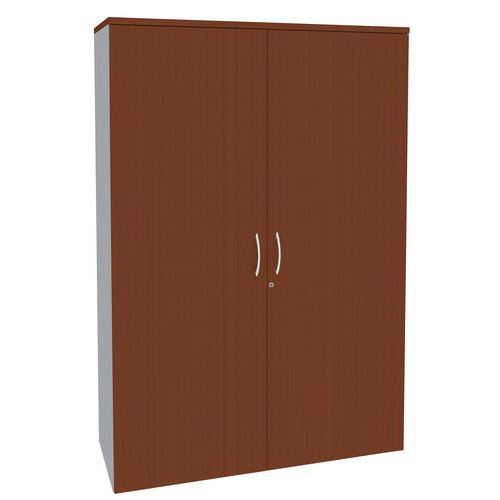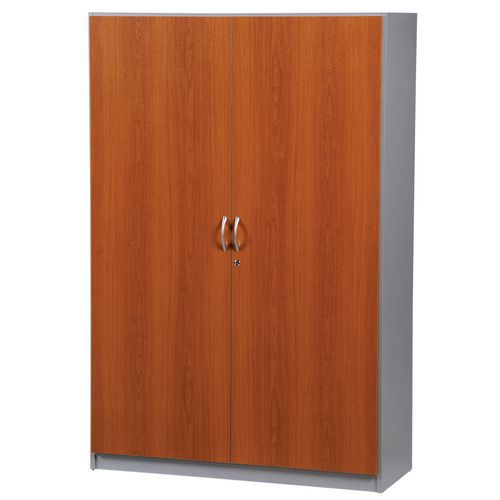 Wysokie szafy biurowe do przechowywania dokumentów i segregatorów. Wykonane z płyty wiórowej. Szafę można zamknąć na klucz. Wyposażona w cztery półki umożliwiające przejrzystą organizację przechowywanych rzeczy. Metalowa rączka w kolorze aluminium. Stopki z możliwością regulacji wysokości.