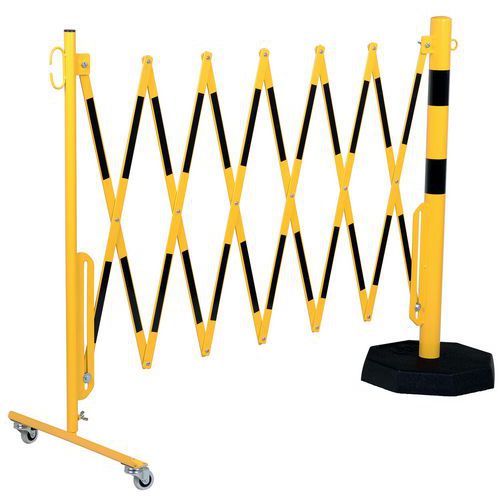 - Składana barierka ochronna na kółkach, z blokadami z jednej strony i słupkiem ochronnym z drugiej strony.
