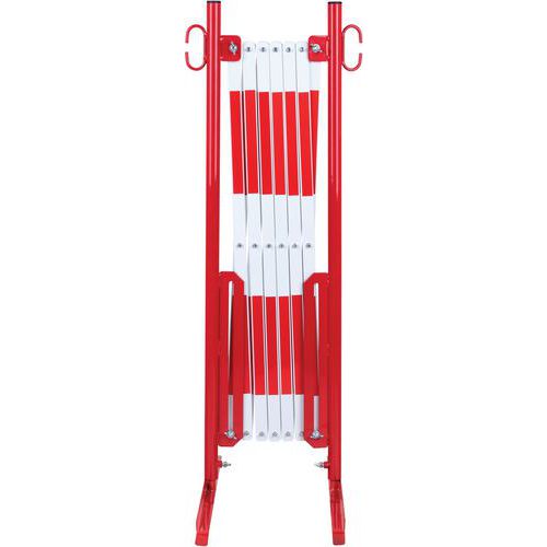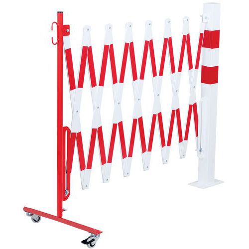 Wysuwana barierka metalowa na kółkach Dancop, kwadratowy słupek 7 x 7 cm, czerwono-biała, długość 400 cm
