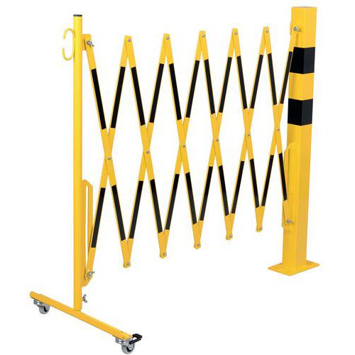 Wysuwana barierka metalowa na kółkach Dancop, kwadratowy słupek 7 x 7 cm, czarno-żółta, długość 360 cm