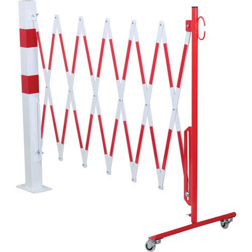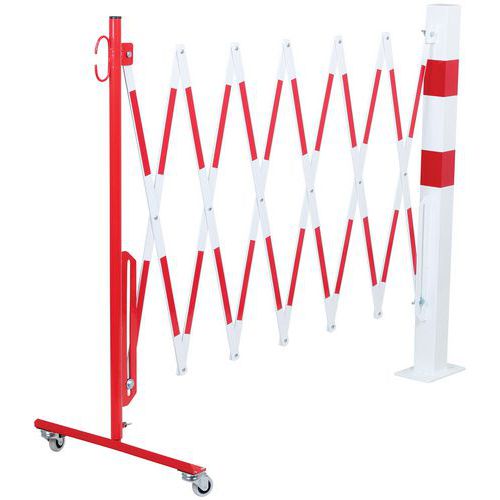 - Składane barierki stalowe z kółkami z jednej strony i kwadratowym słupkiem z drugiej strony.