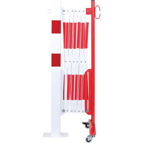Wysuwana barierka metalowa na kółkach Dancop, kwadratowy słupek 7 x 7 cm, czerwono-biała, długość 360 cm