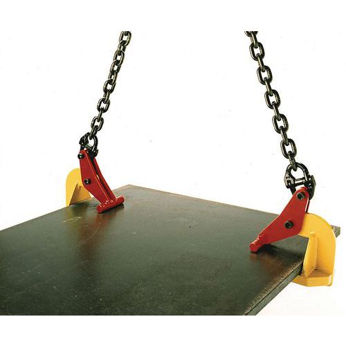 Metalowe zaciski do przemieszczania płyt i blach w poziomie. Posiadają dźwignię zabezpieczającą mocowanie ładunku. Konieczność użycia w parze. Powierzchnia wykończona farbą epoksydową. Temperatura robocza od -20°C do +100°C. Spełniają wymagania normy EN 13155.2003 – współczynnik bezpieczeństwa 3.