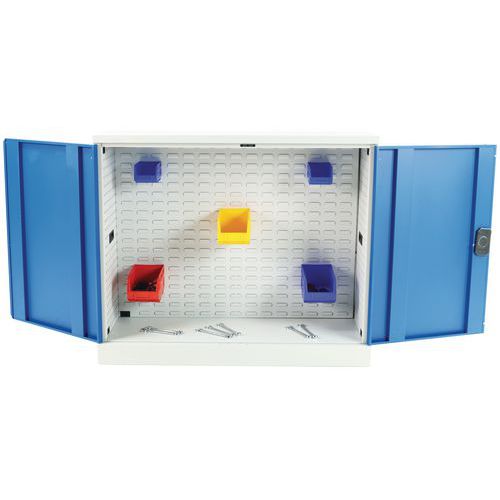 Dno z osłoną pojemnika i panelami bocznymi na haczyki do wieszania narzędzi. Podwójne drzwi obrotowe z zamkiem. Drzwi z amortyzacją zapewniającą ciche zamykanie. Łatwy montaż bez specjalnych narzędzi. Wszystkie produkty Manutan są testowane i zatwierdzane przez nasze zespoły. Wskazówki dotyczące bezpieczeństwa: - Umieść szafę na równej powierzchni. - Przymocuj ją w odpowiedni sposób do ściany lub poprzeczki. - Zadbaj o to, aby nie przekroczyć maksymalnego zalecanego obciążenia, jak również o to, by właściwie je rozłożyć. Gwarancja: 10 lat. Maks. obciążenie (kg) : 150 kg Maks. obciążenie półki (kg) : 50 kg