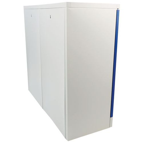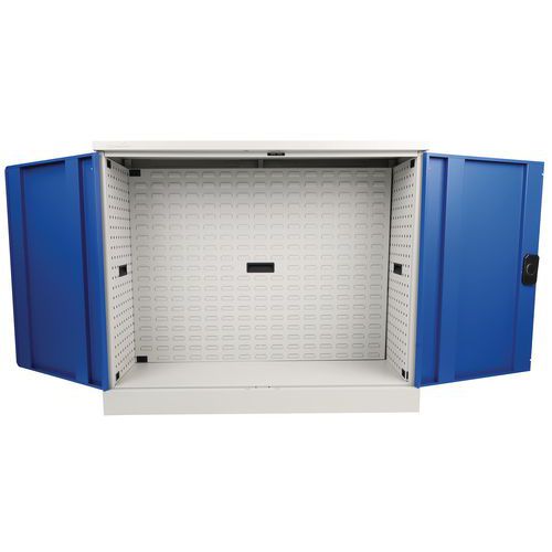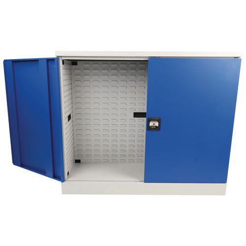 Dno z osłoną pojemnika i panelami bocznymi na haczyki do wieszania narzędzi. Podwójne drzwi obrotowe z zamkiem. Drzwi z amortyzacją zapewniającą ciche zamykanie. Łatwy montaż bez specjalnych narzędzi. Wszystkie produkty Manutan są testowane i zatwierdzane przez nasze zespoły. Wskazówki dotyczące bezpieczeństwa: - Umieść szafę na równej powierzchni. - Przymocuj ją w odpowiedni sposób do ściany lub poprzeczki. - Zadbaj o to, aby nie przekroczyć maksymalnego zalecanego obciążenia, jak również o to, by właściwie je rozłożyć. Gwarancja: 10 lat.