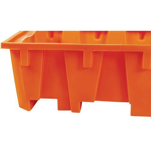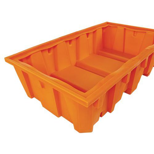 Wanna zbiorcza na 1 IBC z rusztem lub bez. Wyjmowana kratka stalowa lub HDPE. Przejście wideł z 2 stron. Głębokość odpowiednia do regałów paletowych. Zbiornik pasuje do regałów o szerokości 2225 mm.
