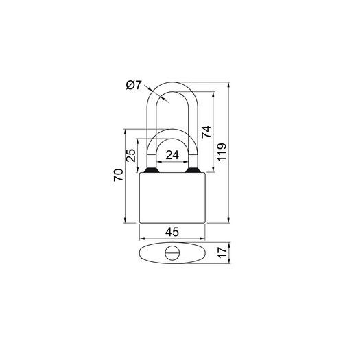 Żeliwna kłódka z wydłużonym jarzmem, średnica jarzma 7 mm, wysokość 65 mm