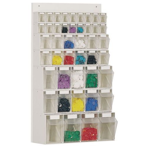 Z 4 rzędami przezroczystych przegródek na zawiasach, zapewniających przejrzystość zawartości.