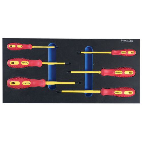 - Zestaw sześciu śrubokrętów elektrotechnicznych umieszczonych w module piankowym.