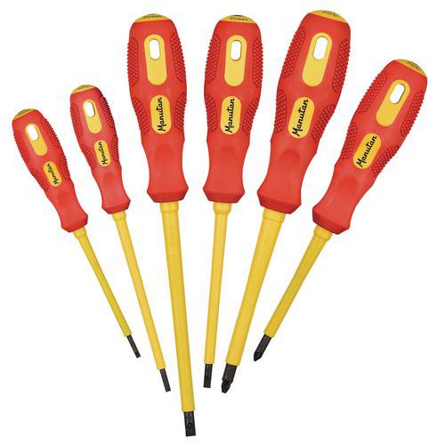 - Zestaw sześciu wkrętaków elektrycznych spełniających międzynarodowe normy dotyczące izolowanych i izolacyjnych narzędzi ręcznych.