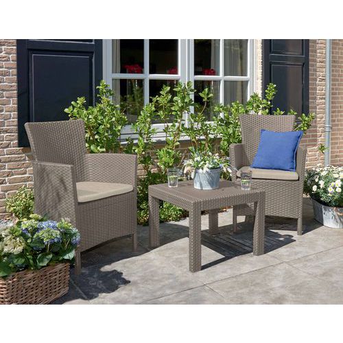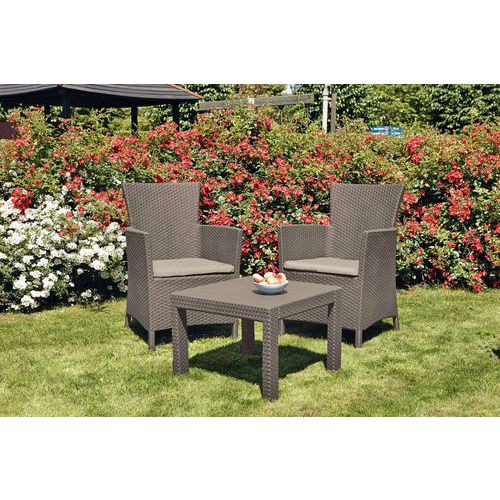 - Mniejszy zestaw ogrodowy Rosario Balcony set jest wykonany z tworzywa sztucznego imitującego rattan.