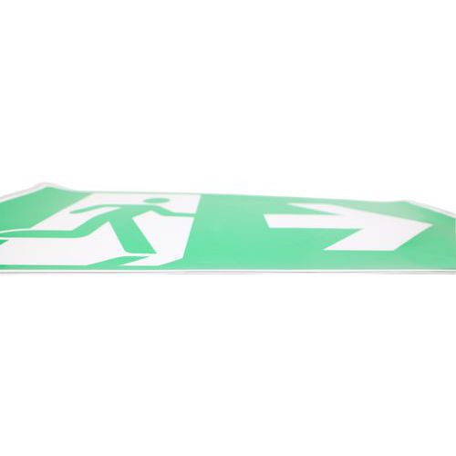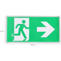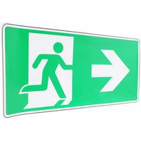Połączenie piktogramu i strzałki po lewej stronie daje jasną i precyzyjną informację o kierunku, w którym należy się udać w sytuacji awaryjnej.