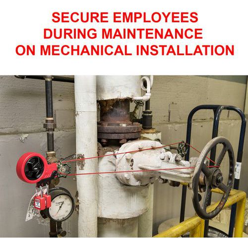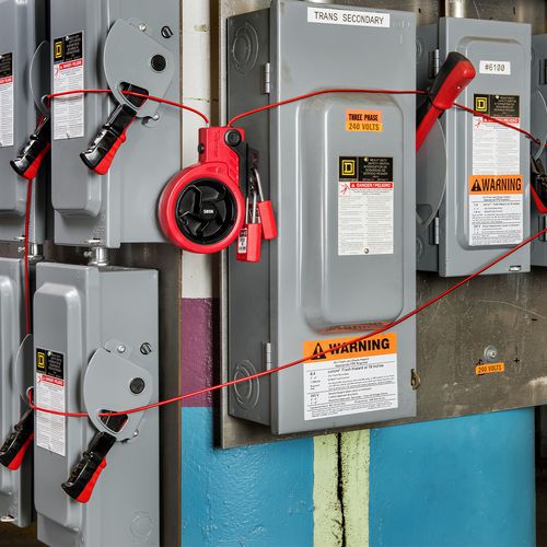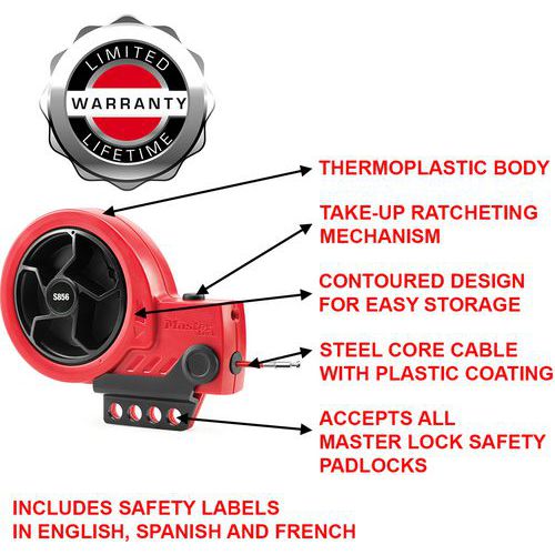 - Urządzenie blokujące Master Lock z chowanym kablem, idealne do zaworów i innych systemów blokujących.